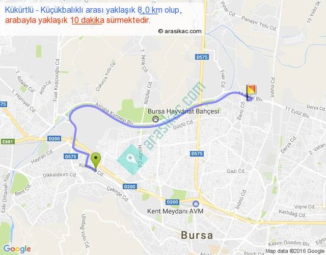 Kükürtlü - Küçükbalıklı arası yaklaşık olarak 90 km/h ile yukarıda belirtilen sürede olup, iki yerin kuş uçuşu uzaklığı (mesafesi) 5'dir. Yolculuk otobüsle 13 dakika sürmektedir.