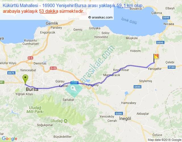 Kükürtlü Mahallesi - 16900 Yenişehir Bursa arası yaklaşık olarak 90 km/h ile yukarıda belirtilen sürede olup, iki yerin kuş uçuşu uzaklığı (mesafesi) 53'dir. Yolculuk otobüsle 1 saat 8 dakika sürmektedir.
