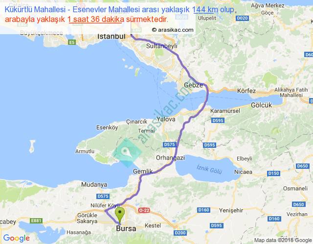 Kükürtlü Mahallesi - Esenevler Mahallesi arası yaklaşık olarak 90 km/h ile yukarıda belirtilen sürede olup, iki yerin kuş uçuşu uzaklığı (mesafesi) 89'dir. Yolculuk otobüsle 2 saat 4 dakika sürmektedir.