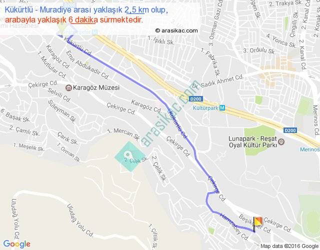 Kükürtlü - Muradiye arası yaklaşık olarak 90 km/h ile yukarıda belirtilen sürede olup, iki yerin kuş uçuşu uzaklığı (mesafesi) 2'dir. Yolculuk otobüsle 7 dakika sürmektedir.