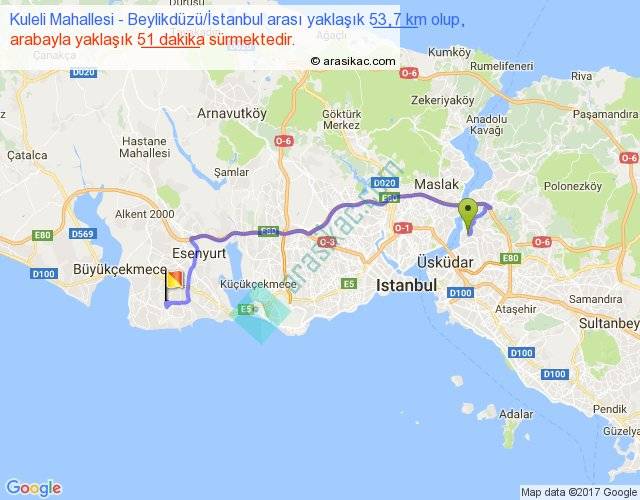 Kuleli Mahallesi - Beylikdüzü İstanbul arası yaklaşık olarak 90 km/h ile yukarıda belirtilen sürede olup, iki yerin kuş uçuşu uzaklığı (mesafesi) 35'dir. Yolculuk otobüsle 1 saat 6 dakika sürmektedir.