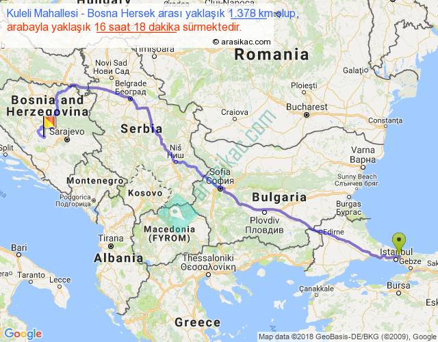 Kuleli Mahallesi - Bosna Hersek arası yaklaşık olarak 90 km/h ile yukarıda belirtilen sürede olup, iki yerin kuş uçuşu uzaklığı (mesafesi) 979'dir. Eğer belirtilen yerler arasında uçak seferi var ise bu süre uçakla 1 saat 30 dakika'ya kadar düşebilir. Yolculuk otobüsle 21 saat 11 dakika sürmektedir.