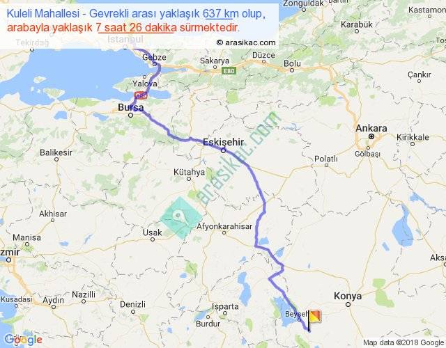 Kuleli Mahallesi - Gevrekli arası yaklaşık olarak 90 km/h ile yukarıda belirtilen sürede olup, iki yerin kuş uçuşu uzaklığı (mesafesi) 458'dir. Eğer belirtilen yerler arasında uçak seferi var ise bu süre uçakla 42 dakika'ya kadar düşebilir. Yolculuk otobüsle 9 saat 39 dakika sürmektedir.