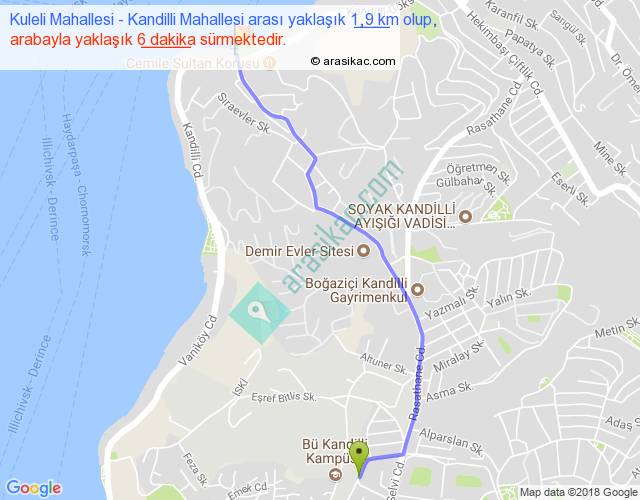 Kuleli Mahallesi - Kandilli Mahallesi arası yaklaşık olarak 90 km/h ile yukarıda belirtilen sürede olup, iki yerin kuş uçuşu uzaklığı (mesafesi) 2'dir. Yolculuk otobüsle 7 dakika sürmektedir.