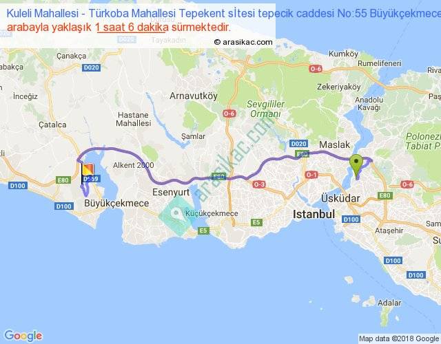 Kuleli Mahallesi - Türkoba Mahallesi Tepekent sİtesi tepecik caddesi No:55 Büyükçekmece arası yaklaşık olarak 90 km/h ile yukarıda belirtilen sürede olup, iki yerin kuş uçuşu uzaklığı (mesafesi) 46'dir. Yolculuk otobüsle 1 saat 25 dakika sürmektedir.
