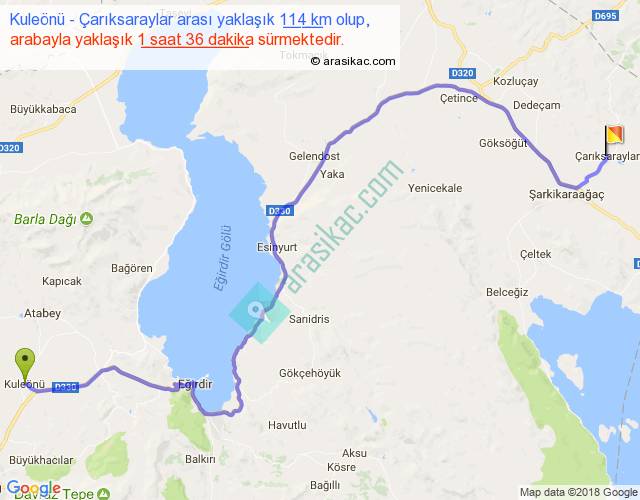 Kuleönü - Çarıksaraylar arası yaklaşık olarak 90 km/h ile yukarıda belirtilen sürede olup, iki yerin kuş uçuşu uzaklığı (mesafesi) 75'dir. Yolculuk otobüsle 2 saat 4 dakika sürmektedir.