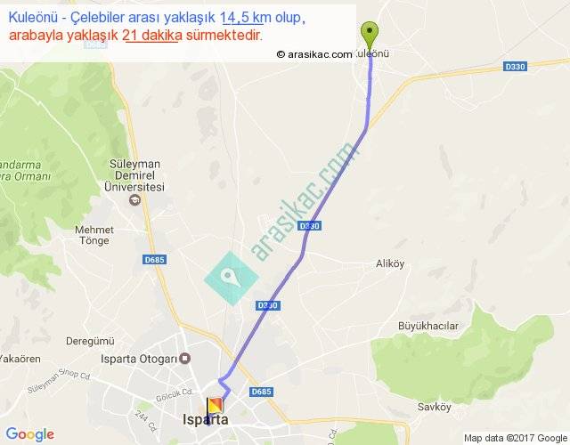 Kuleönü - Çelebiler arası yaklaşık olarak 90 km/h ile yukarıda belirtilen sürede olup, iki yerin kuş uçuşu uzaklığı (mesafesi) 14'dir. Yolculuk otobüsle 27 dakika sürmektedir.