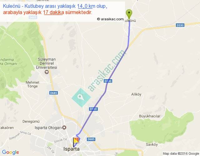 Kuleönü - Kutlubey arası yaklaşık olarak 90 km/h ile yukarıda belirtilen sürede olup, iki yerin kuş uçuşu uzaklığı (mesafesi) 13'dir. Yolculuk otobüsle 22 dakika sürmektedir.