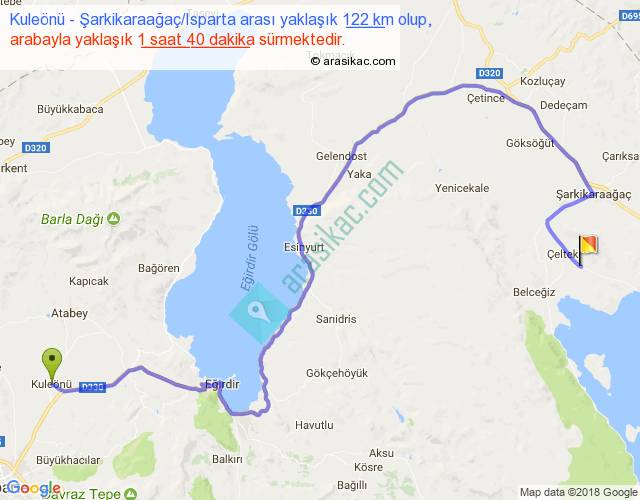 Kuleönü - Şarkikaraağaç Isparta arası yaklaşık olarak 90 km/h ile yukarıda belirtilen sürede olup, iki yerin kuş uçuşu uzaklığı (mesafesi) 65'dir. Yolculuk otobüsle 2 saat 10 dakika sürmektedir.