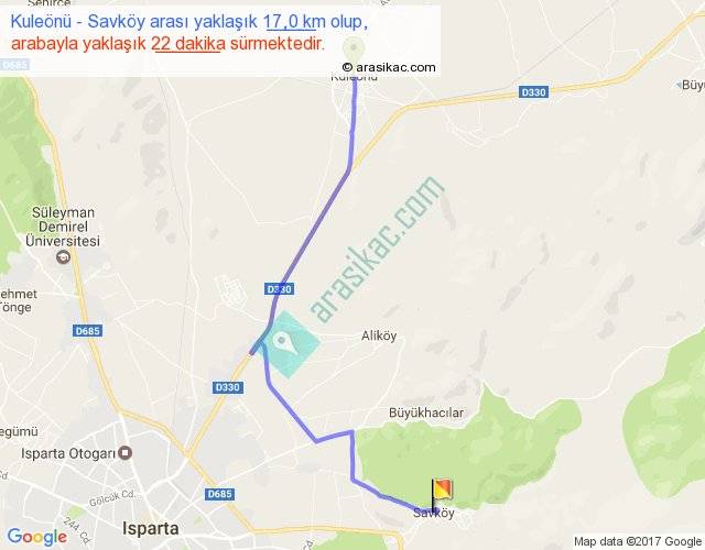 Kuleönü - Savköy arası yaklaşık olarak 90 km/h ile yukarıda belirtilen sürede olup, iki yerin kuş uçuşu uzaklığı (mesafesi) 12'dir. Yolculuk otobüsle 28 dakika sürmektedir.