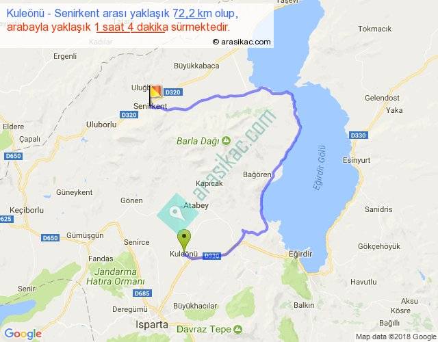 Kuleönü - Senirkent arası yaklaşık olarak 90 km/h ile yukarıda belirtilen sürede olup, iki yerin kuş uçuşu uzaklığı (mesafesi) 27'dir. Yolculuk otobüsle 1 saat 23 dakika sürmektedir.