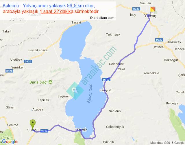 Kuleönü - Yalvaç arası yaklaşık olarak 90 km/h ile yukarıda belirtilen sürede olup, iki yerin kuş uçuşu uzaklığı (mesafesi) 68'dir. Yolculuk otobüsle 1 saat 46 dakika sürmektedir.