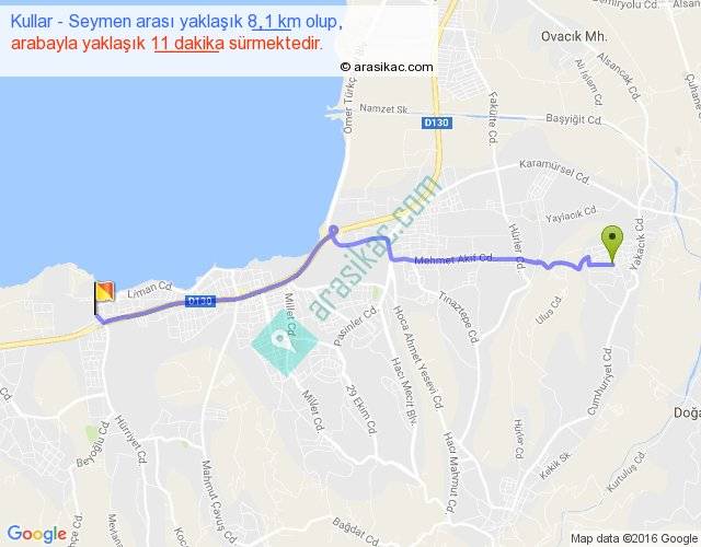 Kullar - Seymen arası yaklaşık olarak 90 km/h ile yukarıda belirtilen sürede olup, iki yerin kuş uçuşu uzaklığı (mesafesi) 7'dir. Yolculuk otobüsle 14 dakika sürmektedir.