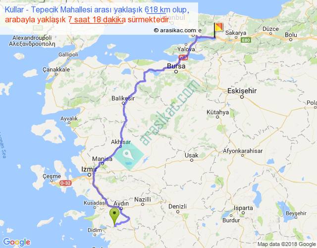 Kullar - Tepecik Mahallesi arası yaklaşık olarak 90 km/h ile yukarıda belirtilen sürede olup, iki yerin kuş uçuşu uzaklığı (mesafesi) 405'dir. Eğer belirtilen yerler arasında uçak seferi var ise bu süre uçakla 37 dakika'ya kadar düşebilir. Yolculuk otobüsle 9 saat 29 dakika sürmektedir.