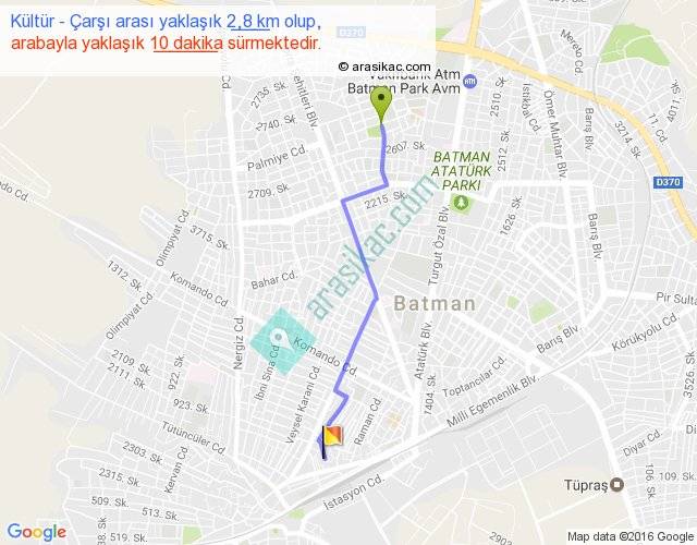 Kültür - Çarşı arası yaklaşık olarak 90 km/h ile yukarıda belirtilen sürede olup, iki yerin kuş uçuşu uzaklığı (mesafesi) 2'dir. Yolculuk otobüsle 13 dakika sürmektedir.