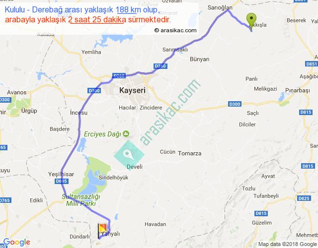 Kululu - Derebağ arası yaklaşık olarak 90 km/h ile yukarıda belirtilen sürede olup, iki yerin kuş uçuşu uzaklığı (mesafesi) 123'dir. Yolculuk otobüsle 3 saat 8 dakika sürmektedir.