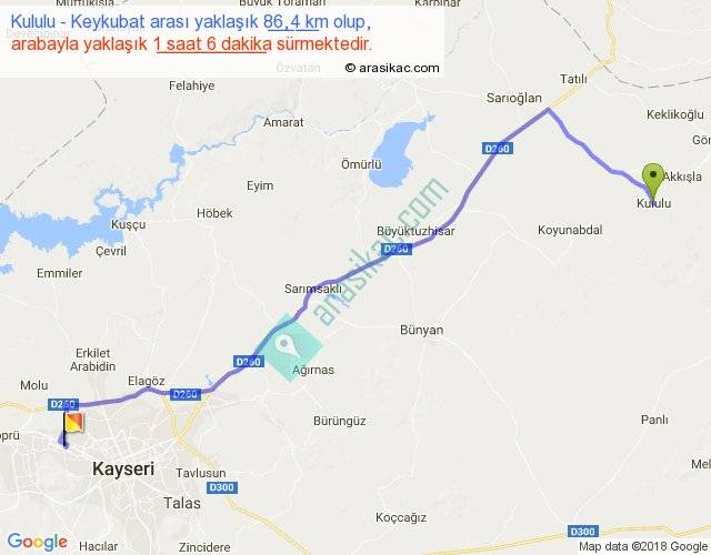Kululu - Keykubat arası yaklaşık olarak 90 km/h ile yukarıda belirtilen sürede olup, iki yerin kuş uçuşu uzaklığı (mesafesi) 68'dir. Yolculuk otobüsle 1 saat 25 dakika sürmektedir.