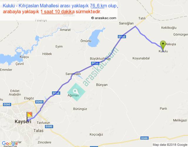Kululu - Kılıçaslan Mahallesi arası yaklaşık olarak 90 km/h ile yukarıda belirtilen sürede olup, iki yerin kuş uçuşu uzaklığı (mesafesi) 61'dir. Yolculuk otobüsle 1 saat 31 dakika sürmektedir.
