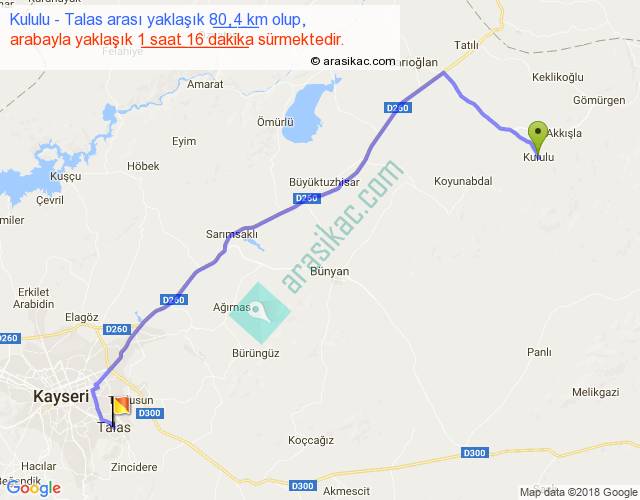 Kululu - Talas arası yaklaşık olarak 90 km/h ile yukarıda belirtilen sürede olup, iki yerin kuş uçuşu uzaklığı (mesafesi) 59'dir. Yolculuk otobüsle 1 saat 38 dakika sürmektedir.