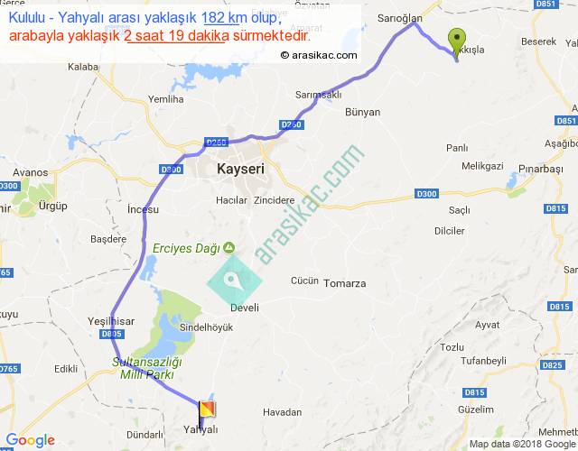 Kululu - Yahyalı arası yaklaşık olarak 90 km/h ile yukarıda belirtilen sürede olup, iki yerin kuş uçuşu uzaklığı (mesafesi) 118'dir. Yolculuk otobüsle 3 saat 0 dakika sürmektedir.