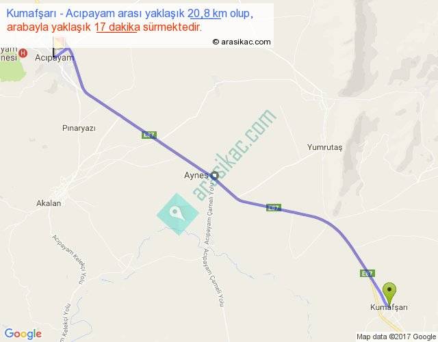 Kumafşarı - Acıpayam arası yaklaşık olarak 90 km/h ile yukarıda belirtilen sürede olup, iki yerin kuş uçuşu uzaklığı (mesafesi) 18'dir. Yolculuk otobüsle 22 dakika sürmektedir.