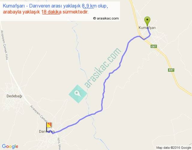 Kumafşarı - Darıveren arası yaklaşık olarak 90 km/h ile yukarıda belirtilen sürede olup, iki yerin kuş uçuşu uzaklığı (mesafesi) 7'dir. Yolculuk otobüsle 23 dakika sürmektedir.