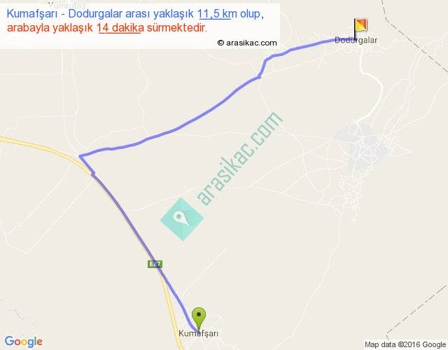 Kumafşarı - Dodurgalar arası yaklaşık olarak 90 km/h ile yukarıda belirtilen sürede olup, iki yerin kuş uçuşu uzaklığı (mesafesi) 7'dir. Yolculuk otobüsle 18 dakika sürmektedir.