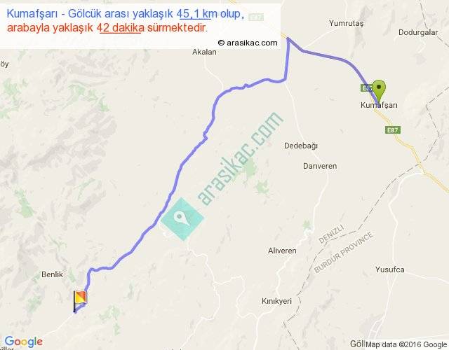 Kumafşarı - Gölcük arası yaklaşık olarak 90 km/h ile yukarıda belirtilen sürede olup, iki yerin kuş uçuşu uzaklığı (mesafesi) 32'dir. Yolculuk otobüsle 54 dakika sürmektedir.