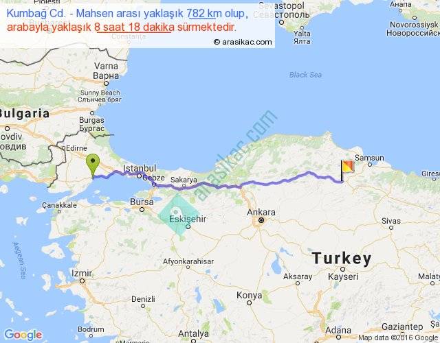 Kumbağ Cd. - Mahsen arası yaklaşık olarak 90 km/h ile yukarıda belirtilen sürede olup, iki yerin kuş uçuşu uzaklığı (mesafesi) 665'dir. Eğer belirtilen yerler arasında uçak seferi var ise bu süre uçakla 1 saat 01 dakika'ya kadar düşebilir. Yolculuk otobüsle 10 saat 47 dakika sürmektedir.