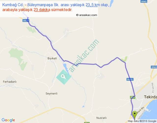 Kumbağ Cd. - Süleymanpaşa Sk. arası yaklaşık olarak 90 km/h ile yukarıda belirtilen sürede olup, iki yerin kuş uçuşu uzaklığı (mesafesi) 18'dir. Yolculuk otobüsle 29 dakika sürmektedir.