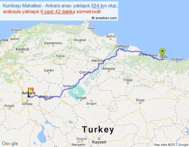 Kumbaşı Mahallesi - Ankara arası yaklaşık olarak 90 km/h ile yukarıda belirtilen sürede olup, iki yerin kuş uçuşu uzaklığı (mesafesi) 435'dir. Eğer belirtilen yerler arasında uçak seferi var ise bu süre uçakla 40 dakika'ya kadar düşebilir. Yolculuk otobüsle 8 saat 42 dakika sürmektedir.
