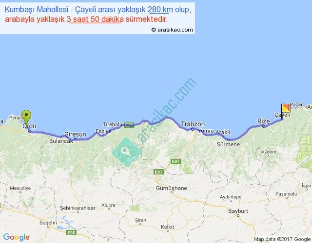 Kumbaşı Mahallesi - Çayeli arası yaklaşık olarak 90 km/h ile yukarıda belirtilen sürede olup, iki yerin kuş uçuşu uzaklığı (mesafesi) 241'dir. Yolculuk otobüsle 4 saat 59 dakika sürmektedir.