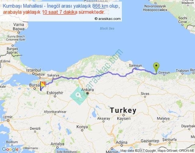 Kumbaşı Mahallesi - İnegöl arası yaklaşık olarak 90 km/h ile yukarıda belirtilen sürede olup, iki yerin kuş uçuşu uzaklığı (mesafesi) 707'dir. Eğer belirtilen yerler arasında uçak seferi var ise bu süre uçakla 1 saat 05 dakika'ya kadar düşebilir. Yolculuk otobüsle 13 saat 9 dakika sürmektedir.