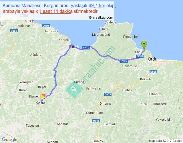 Kumbaşı Mahallesi - Korgan arası yaklaşık olarak 90 km/h ile yukarıda belirtilen sürede olup, iki yerin kuş uçuşu uzaklığı (mesafesi) 46'dir. Yolculuk otobüsle 1 saat 32 dakika sürmektedir.