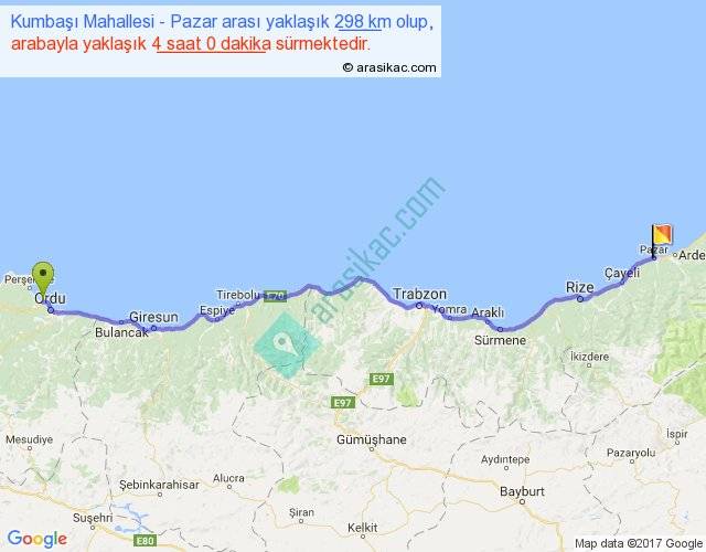 Kumbaşı Mahallesi - Pazar arası yaklaşık olarak 90 km/h ile yukarıda belirtilen sürede olup, iki yerin kuş uçuşu uzaklığı (mesafesi) 254'dir. Eğer belirtilen yerler arasında uçak seferi var ise bu süre uçakla 23 dakika'ya kadar düşebilir. Yolculuk otobüsle 5 saat 12 dakika sürmektedir.