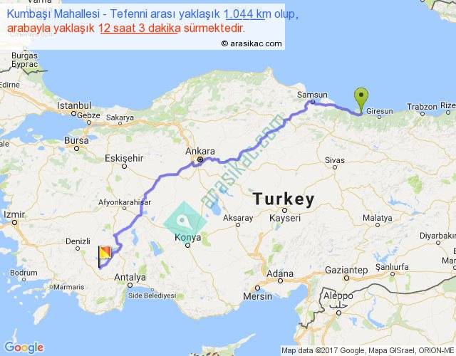 Kumbaşı Mahallesi - Tefenni arası yaklaşık olarak 90 km/h ile yukarıda belirtilen sürede olup, iki yerin kuş uçuşu uzaklığı (mesafesi) 803'dir. Eğer belirtilen yerler arasında uçak seferi var ise bu süre uçakla 1 saat 14 dakika'ya kadar düşebilir. Yolculuk otobüsle 15 saat 39 dakika sürmektedir.