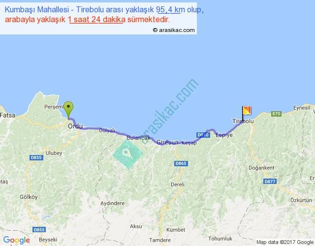 Kumbaşı Mahallesi - Tirebolu arası yaklaşık olarak 90 km/h ile yukarıda belirtilen sürede olup, iki yerin kuş uçuşu uzaklığı (mesafesi) 81'dir. Yolculuk otobüsle 1 saat 49 dakika sürmektedir.