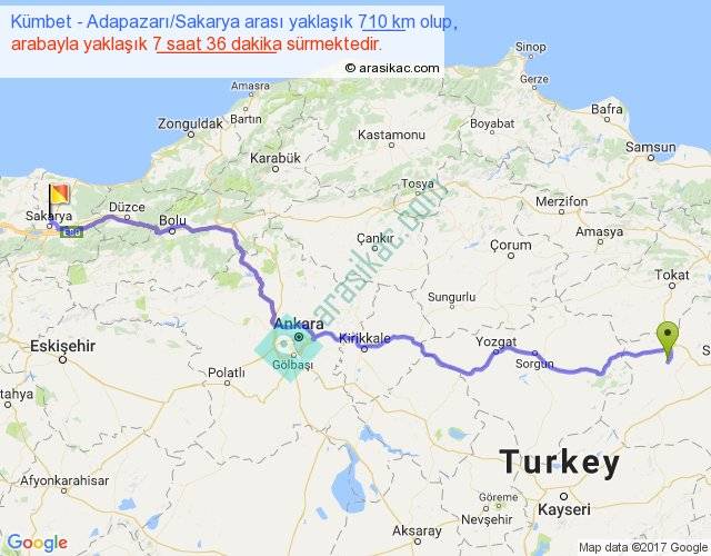 Kümbet - Adapazarı Sakarya arası yaklaşık olarak 90 km/h ile yukarıda belirtilen sürede olup, iki yerin kuş uçuşu uzaklığı (mesafesi) 527'dir. Eğer belirtilen yerler arasında uçak seferi var ise bu süre uçakla 48 dakika'ya kadar düşebilir. Yolculuk otobüsle 9 saat 52 dakika sürmektedir.