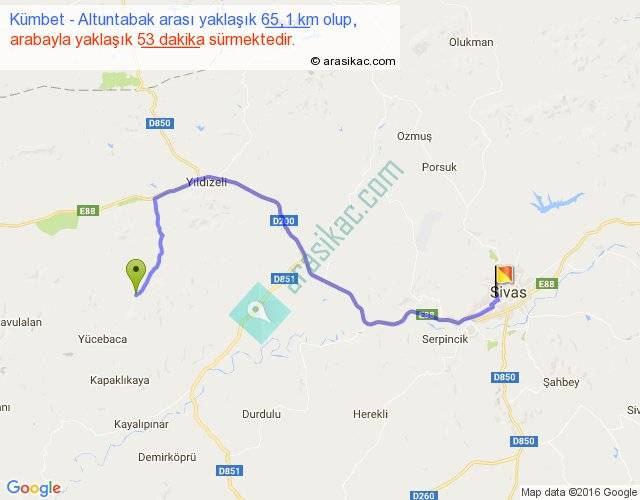 Kümbet - Altuntabak arası yaklaşık olarak 90 km/h ile yukarıda belirtilen sürede olup, iki yerin kuş uçuşu uzaklığı (mesafesi) 42'dir. Yolculuk otobüsle 1 saat 8 dakika sürmektedir.