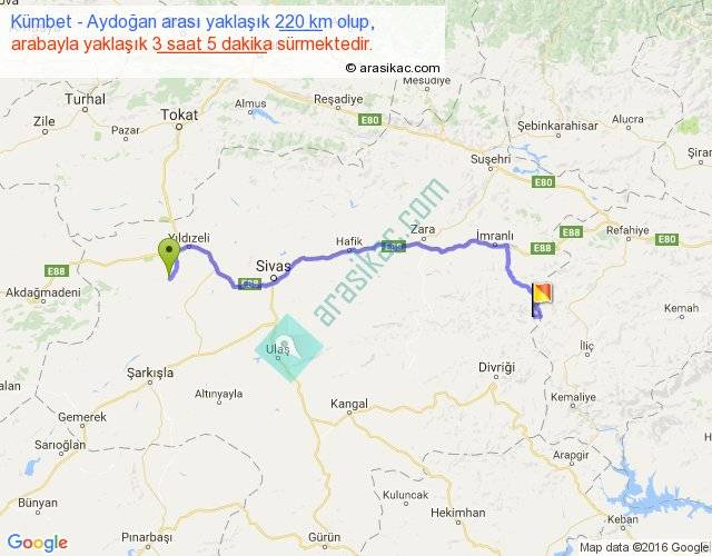 Kümbet - Aydoğan arası yaklaşık olarak 90 km/h ile yukarıda belirtilen sürede olup, iki yerin kuş uçuşu uzaklığı (mesafesi) 154'dir. Yolculuk otobüsle 4 saat 0 dakika sürmektedir.