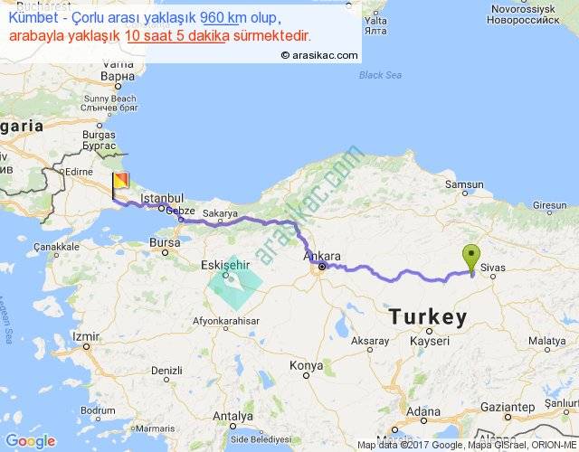 Kümbet - Çorlu arası yaklaşık olarak 90 km/h ile yukarıda belirtilen sürede olup, iki yerin kuş uçuşu uzaklığı (mesafesi) 747'dir. Eğer belirtilen yerler arasında uçak seferi var ise bu süre uçakla 1 saat 08 dakika'ya kadar düşebilir. Yolculuk otobüsle 13 saat 6 dakika sürmektedir.