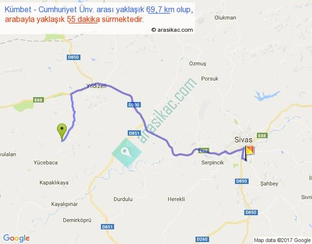 Kümbet - Cumhuriyet Ünv. arası yaklaşık olarak 90 km/h ile yukarıda belirtilen sürede olup, iki yerin kuş uçuşu uzaklığı (mesafesi) 44'dir. Yolculuk otobüsle 1 saat 11 dakika sürmektedir.