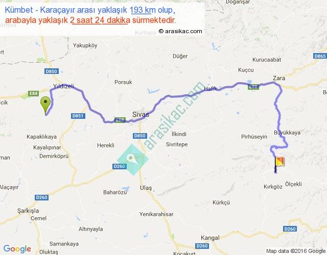 Kümbet - Karaçayır arası yaklaşık olarak 90 km/h ile yukarıda belirtilen sürede olup, iki yerin kuş uçuşu uzaklığı (mesafesi) 109'dir. Yolculuk otobüsle 3 saat 7 dakika sürmektedir.