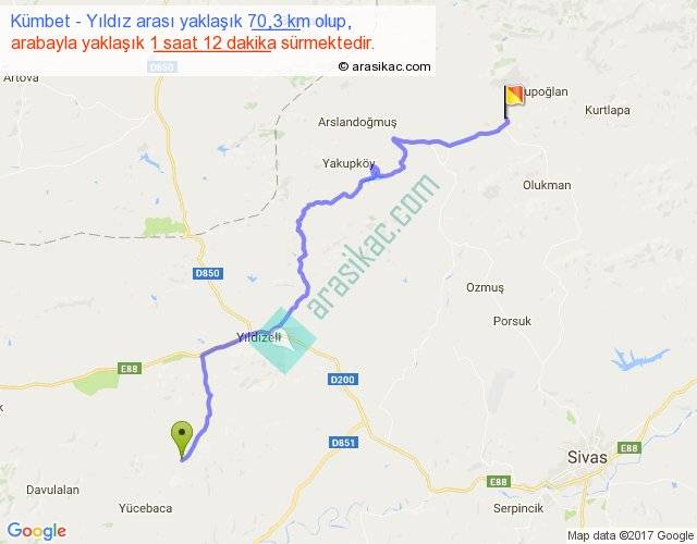 Kümbet - Yıldız arası yaklaşık olarak 90 km/h ile yukarıda belirtilen sürede olup, iki yerin kuş uçuşu uzaklığı (mesafesi) 50'dir. Yolculuk otobüsle 1 saat 33 dakika sürmektedir.