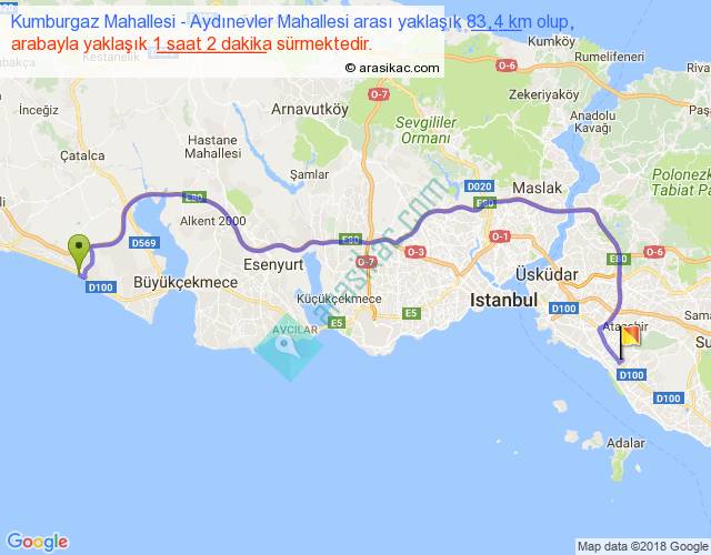 Kumburgaz Mahallesi - Aydınevler Mahallesi arası yaklaşık olarak 90 km/h ile yukarıda belirtilen sürede olup, iki yerin kuş uçuşu uzaklığı (mesafesi) 57'dir. Yolculuk otobüsle 1 saat 20 dakika sürmektedir.
