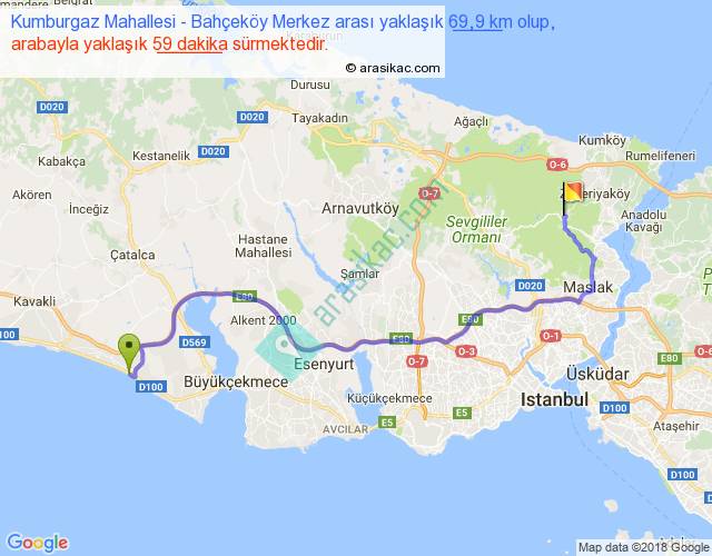 Kumburgaz Mahallesi - Bahçeköy Merkez arası yaklaşık olarak 90 km/h ile yukarıda belirtilen sürede olup, iki yerin kuş uçuşu uzaklığı (mesafesi) 48'dir. Yolculuk otobüsle 1 saat 16 dakika sürmektedir.