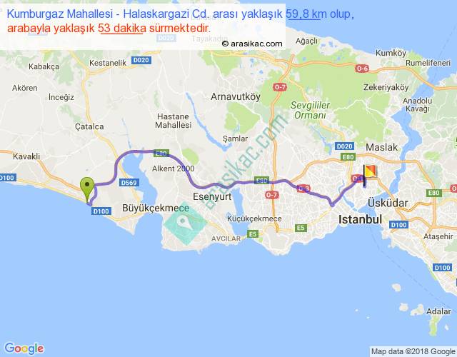 Kumburgaz Mahallesi - Halaskargazi Cd. arası yaklaşık olarak 90 km/h ile yukarıda belirtilen sürede olup, iki yerin kuş uçuşu uzaklığı (mesafesi) 45'dir. Yolculuk otobüsle 1 saat 8 dakika sürmektedir.