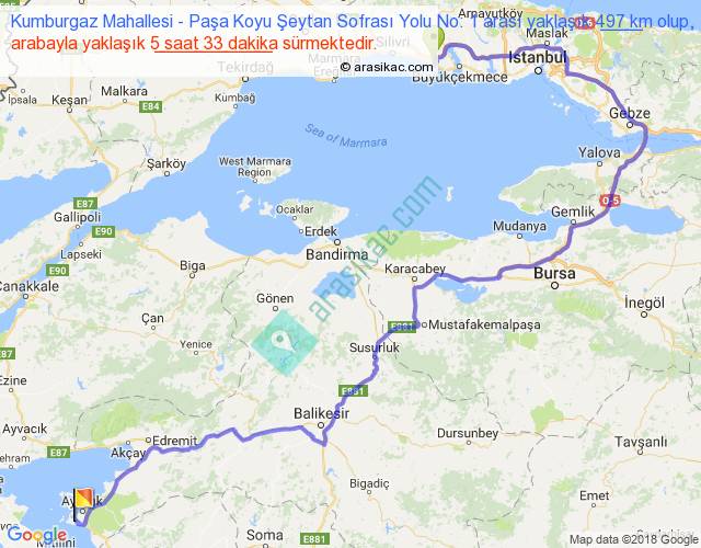 Kumburgaz Mahallesi - Paşa Koyu Şeytan Sofrası Yolu No: 1 arası yaklaşık olarak 90 km/h ile yukarıda belirtilen sürede olup, iki yerin kuş uçuşu uzaklığı (mesafesi) 246'dir. Yolculuk otobüsle 7 saat 12 dakika sürmektedir.