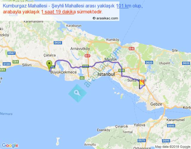 Kumburgaz Mahallesi - Şeyhli Mahallesi arası yaklaşık olarak 90 km/h ile yukarıda belirtilen sürede olup, iki yerin kuş uçuşu uzaklığı (mesafesi) 71'dir. Yolculuk otobüsle 1 saat 42 dakika sürmektedir.