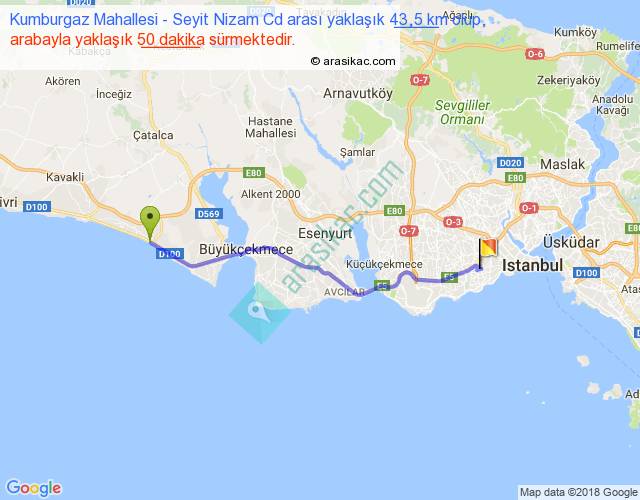 Kumburgaz Mahallesi - Seyit Nizam Cd arası yaklaşık olarak 90 km/h ile yukarıda belirtilen sürede olup, iki yerin kuş uçuşu uzaklığı (mesafesi) 38'dir. Yolculuk otobüsle 1 saat 5 dakika sürmektedir.